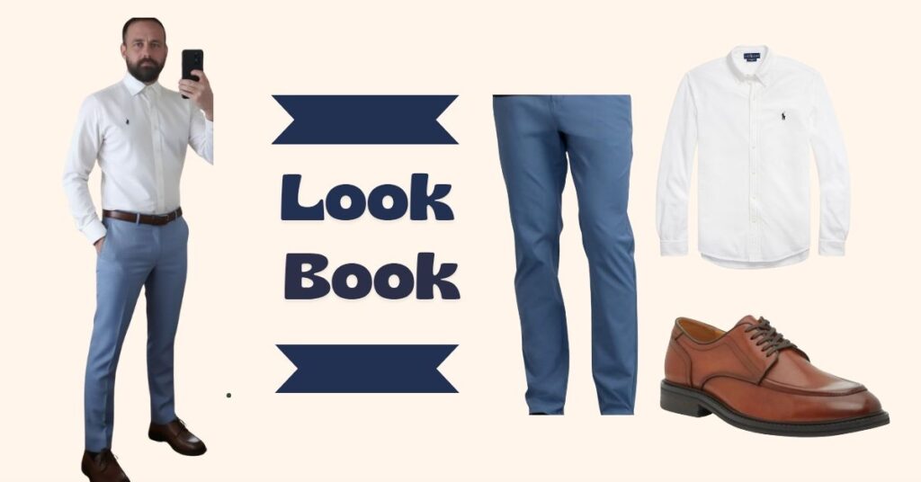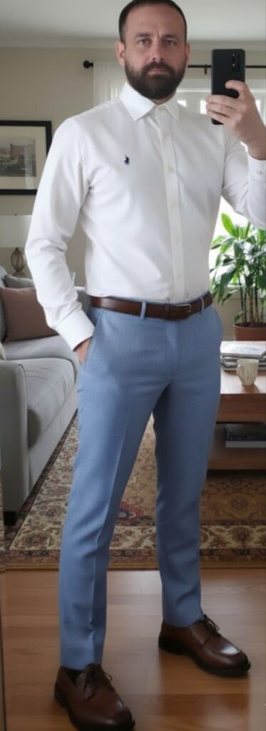 I started with a Ralph Lauren crisp white button‑down shirt, which provides a clean base and feels airy against the skin. At 5’11” and 165 pounds, I find that a fitted shirt with minimal embellishments creates a lean silhouette without feeling tight. It’s the perfect business casual outfit.